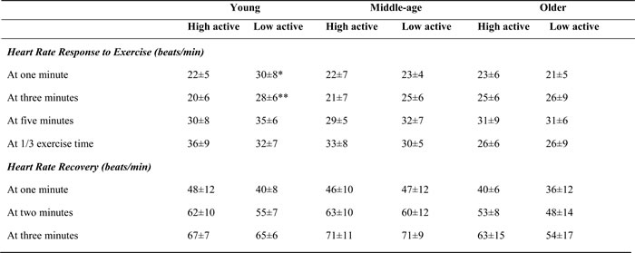 Table 4: Heart rate response to exercise and recovery stratified by age and physical activity