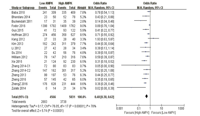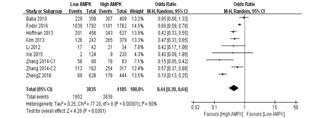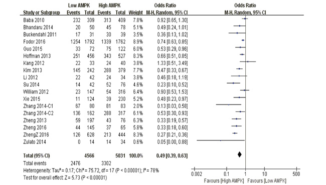 5-year overall survival Our pooled analysis suggested that AMPK over-expression was a favorable indicator of 5-year overall survival among cancer suffers, in contrast to those with restricted levels (P<0.0001) (Figure 3).