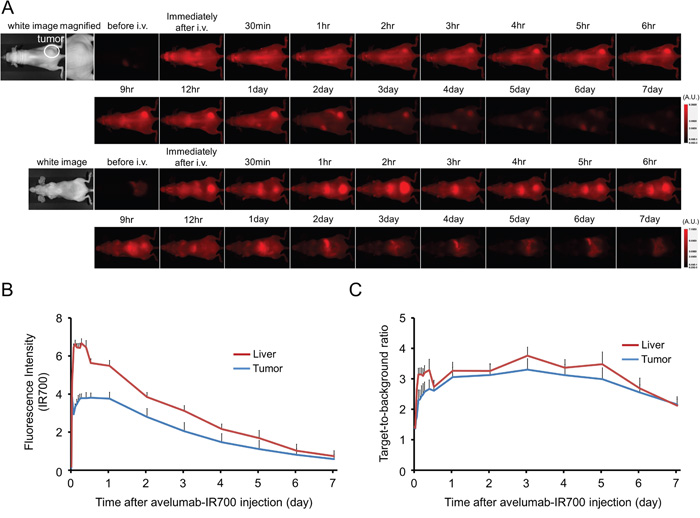 H441 cells (2 × 106) were injected subcutaneously in the right dorsum of the mice. Tumors were studied after they reached volumes of approximately 50 mm3. Serial ventral and dorsal fluorescence images of IR700 were obtained with a Pearl Imager using a 700 nm fluorescence channel before and 0, ½, 1, 2, 3, 4, 5, 6, 9, 12, 24, 48, 72, 96, 120, 144, and 168 hours after i.v. injection of 100 μg of avelumab-IR700 via the tail vein. Pearl Cam Software (LICOR Biosciences, Lincoln, NE) was used for analyzing fluorescence intensities. Region of interests (ROIs) were placed on the tumor and liver. ROIs were also placed in the adjacent non-tumor region as background (left dorsum and lower abdomen). Average fluorescence intensity of each ROI was calculated. TBRs (fluorescence intensities of target/fluorescence intensities of background) were also calculated (n = 10).