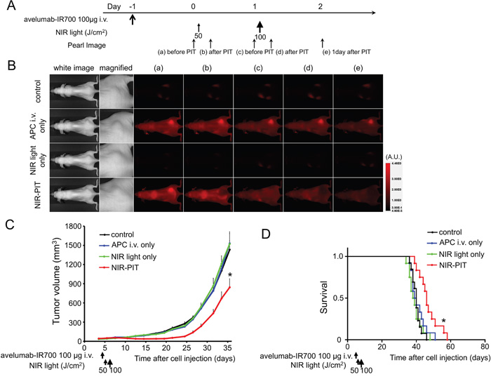 H441 cells (2 × 106) were injected subcutaneously in the right dorsum of the mice. Tumors were studied after they reached volumes of approximately 50 mm3. To examine the therapeutic effect of in vivo NIR-PIT on H441 cells, tumor-bearing mice were randomized into 4 groups of at least 10 animals per group for the following treatments: (1) no treatment (control); (2) 100 μg of avelumab-IR700 i.v., no NIR light exposure (APC i.v. only); (3) NIR light exposure only, NIR light was administered at 50 J/cm2 on day 1 and 100 J/cm2 on day 2 (NIR light only); (4) 100 μg of avelumab-IR700 i.v., NIR light was administered at 50 J/cm2 on day 1 after injection and 100 J/cm2 on day 2 after injection (NIR-PIT). Serial fluorescence images, as well as white light images, were obtained before and after each NIR light exposure (day 1 and day 2) using a Pearl Imager with a 700 nm fluorescence channel.