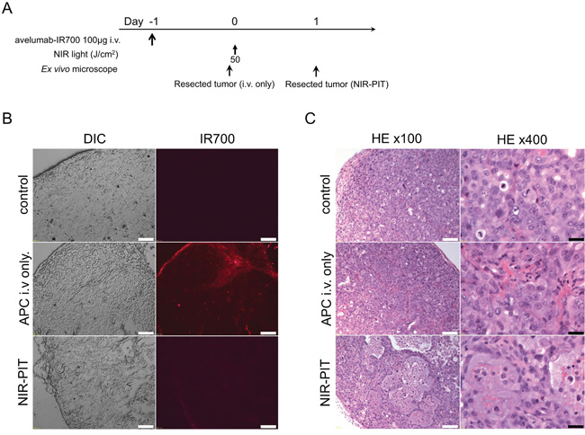 Avelumab, a fully human anti-PD-L1 mAb, showed accumulation in PD-L1-expressing cancer cells. NIR-PIT using avelumab-IR700 can induce significant therapeutic responses after only a single injection of the conjugate and two light exposures in a PD-L1-expressing animal tumor model. Thus, NIR-PIT utilizing PD-L1 as the targeting antigen for the APC might be successful in treating cancers that have not previously responded to the naked antibody alone.