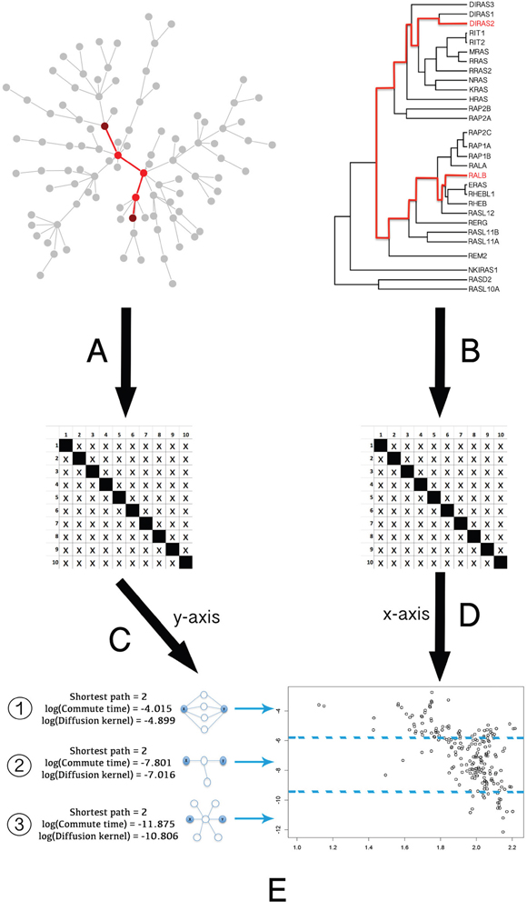 Figure 2: General pipeline of the Ras protein pairs phylogenetic and network distance measurements and comparison. A. Pairwise distance calculation in the PPI graph, expressed as a matrix. B. Pairwise phylogenetic distance calculation in the tree, expressed as a matrix. C. Logarithmical transformation to normalize network distances between proteins. D. Exponential transformation to normalize phylogenetic distances between proteins. E. Graphical representation of both the proteins phylogenetic and network distances. As we can see in the left side of E, distance measures based on kernels (e.g. DK or CT), compared to shortest path calculation (minimum number of edges connecting two given nodes), are able to distinguish the level of association between two Ras nodes connected through different topologies: 1) highly connected nodes; 2) low connected; 3) nonspecifically connected. This result demonstrates that kernel similarity metric is one of the better measures to deal with the kind of artifacts produced by highly connected network hubs (see section 1 in Supplementary material).