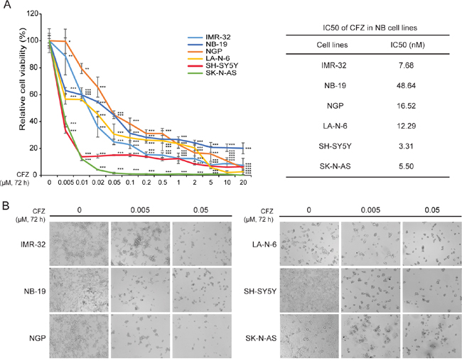 Figure 1: CFZ shows cytotoxic effect on a panel of six NB cells. A. Six NB cell lines were treated with increasing concentrations (0 μM, 0.005 μM, 0.01 μM, 0.02 μM, 0.05 μM, 0.1 μM, 0.2 μM, 0.5 μM, 1 μM, 2 μM, 5 μM, 10 μM, 20 μM) of CFZ for 72 h. Cell viability was assessed by CCK-8 assay. P<0.05 (*), P<0.01 (**), or P<0.001 (***) (Student’s t-test, two-tailed) as indicated. The IC50 values of CFZ in each cell line listed were calculated in Graphpad Prism 5 and based on the data collected in the cell viability assay. B. Morphological changes of the six different NB cell lines treated with increasing concentrations (0 μM, 0.005 μM, 0.05 μM) of CFZ for 72 h were shown.