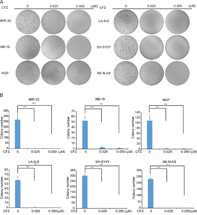 Figure 2: CFZ suppresses anchorage-independent growth of NB cells. A. A panel of six NB cell lines were seeded in six-well plates with indicated concentrations of CFZ and agar, and grown for 2 to 3 weeks. Cells were stained with crystal violet for 4 h, and images were obtained. B. Colonies were counted and colony numbers were represented as mean ± SD with P<0.001 (***) (ANOVA, Dunnett) as indicated.