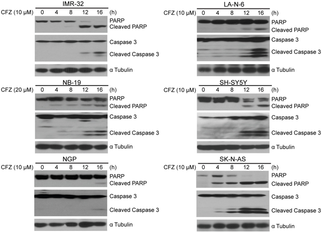 Figure 3: CFZ induces apoptosis of NB cells. A panel of six cell lines were treated with 10 or 20 μM of CFZ for 0 h, 4 h, 8 h, 12 h or 16 h, subjected to SDS-PAGE, and then immunoblotted with anti-PARP, anti-Caspase 3, and anti-α Tubulin antibodies.
