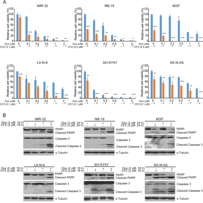 Figure 4: CFZ enhances the cytotoxic effect of Dox on NB cells. A. Six NB cell lines were treated with increasing concentrations of Dox or combined with CFZ (0.1 μM or 0.5 μM) for 48 h. Cell viability was assessed by CCK-8 assay with P<0.05 (*), P<0.01 (**), or P<0.001 (***) (Student’s t-test, two-tailed) as indicated. B. Six cell lines were treated with either Dox (2 μM) alone, CFZ (2 μM or 5 μM) alone, or a combination of both for a fixed 16 h. Then, they were subjected to SDS-PAGE and immunoblotted for anti-PARP, and anti-Caspase 3 antibodies. The anti-α Tubulin antibody was used as a loading control for whole cell extracts in all samples.