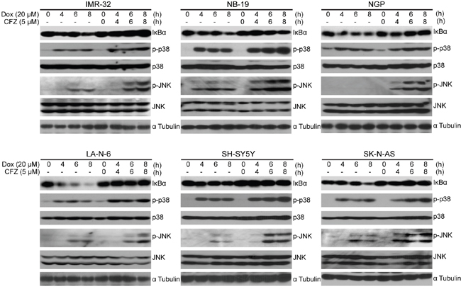 Figure 5: CFZ inhibits Dox-induced IκBα degradation and enhances Dox-induced p38 and JNK phosphorylation in NB cells. A panel of six cell lines were treated with 20 μM of Dox or the combination of 10 μM CFZ and 20 μM Dox for 0 h, 4 h, 6 h or 8 h points, subjected to SDS-PAGE, and then immunoblotted with anti-IκBα, anti-p-p38, anti-p38, anti-p-JNK, anti-JNK and anti-α tubulin antibodies.