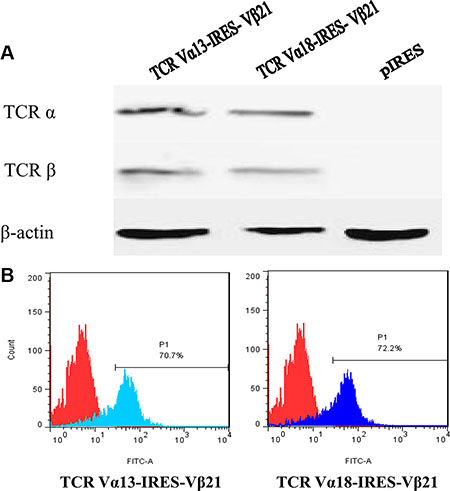 Figure 2: Expression of TCR α13/β21 and α18/β21 on HEK 293 cells and Jurkat T cells transduced with TCR Vα13-IRES-Vβ21 and Vα18-IRES-Vβ21. (A) Western blot analysis of TCR α13, α18 and β21 on HEK 293 cells transdued with TCR Vα13-IRES- Vβ21 , Vα18-IRES-Vβ21 and pIRES. (B) Transduced Jurkat T cells were stained with mouse anti-human TCR Vβ21.3 monoclonal antibody and analyzed by flow cytometry.
