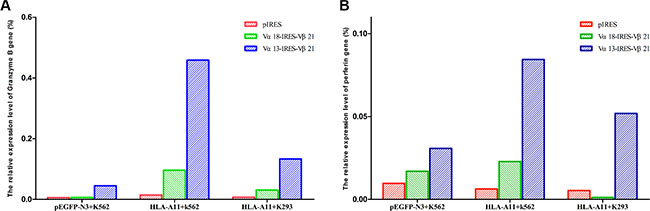 Granzyme B and perforin are expressed by CTLs and play an important role in their cytotoxic activity. Perforin is required for cytolysis, and granzymes efficiently induce target cell death; thus, the granzyme B and perforin expression level in TCR-transduced T cells can reflect cytotoxicity strength. We found that the granzyme B and perforin expression level in TCR α13/β21-transduced T cells in response to HLA-A*11+ K562 cells was 4.8- and 3.6-fold greater, respectively, than that in TCR α18/β21-transduced T cells, and the levels were 31.6- and 13.5-fold greater than that in empty plasmid transfected T cells. In addition, the expression level of granzyme B and perforin in TCR α13/β21-transduced T cells in response to HLA-A11+K293 and pEGFP-N3+K562 cells was also greater than that in TCR α18/β21-transduced T cells and empty plasmid-transfected T cells (Figure 5).