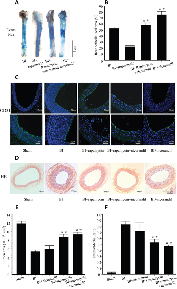 Figure 1: Nicorandil promotes reendothelialization impaired by rapamycin. A., SD rats received BI procedure were randomized to vehicles, rapamycin, nicorandil or rapamycin-nicorandil co-treatment. Reendothelialization area is the area that does not uptake Evans blue dye. B., Summary data for reendothelialization is expressed in percentage. Values are mean±SE. **p<0.01 vs. rapamycin group. C., Immunostaining of PECAM-1 (CD31) in rats treated with vehicles, rapamycin, nicorandil or rapamycin-nicorandil co-treatment. D., Cross sections of carotid arteries in different groups 14 days after BI. Sections were stained with H&E. E. Quantitative analysis of lumen area. Bars represent means±SE. **p<0.01 vs. BI group. F. Quantitative analysis of intima to media area ratio. Bars represent means±SE. **p<0.01 vs. BI group.
