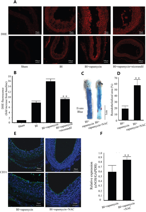 We detected ROS production in carotid arteries by DHE staining. BI group showed a high fluorescence signal in intima area and rapamycin further increased ROS production. However, co-treatment with nicorandil significantly decreased ROS production (p<0.01) (Figure 2A and Figure 2B). To confirm the role of ROS in rapamycin-impaired reendothelialization, NAC, a cell permeable antioxidant was used as additional treatment. NAC accelerated reendothelialization impaired by rapamycin from 19.9±4.45% to 56.7±7.22% (p<0.01) (Figure 2C and Figure 2D). PECAM-1 (CD31) positive length in lumen surface and eNOS expression in carotid arteries were also accelerated by NAC (Figure 2E and Figure 2F), consistent with the results of Evans blue staining.
