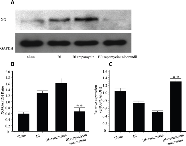We detected XO in carotid arteries of different groups by western blotting. XO is activated in BI group. Rapamycin increased XO protein level in injured arteries. Co-treatment of nicorandil significantly inhibited rapamycin-induced XO protein production (p<0.01) (Figure 3A and Figure 3B). eNOS is an indicator of reendothelialization [18]. We tested eNOS mRNA expression by qRT-PCR. Rapamycin decreased eNOS production 14 days after balloon injury. Nicorandil reversed eNOS expression inhibited by rapamycin (Figure 3C).