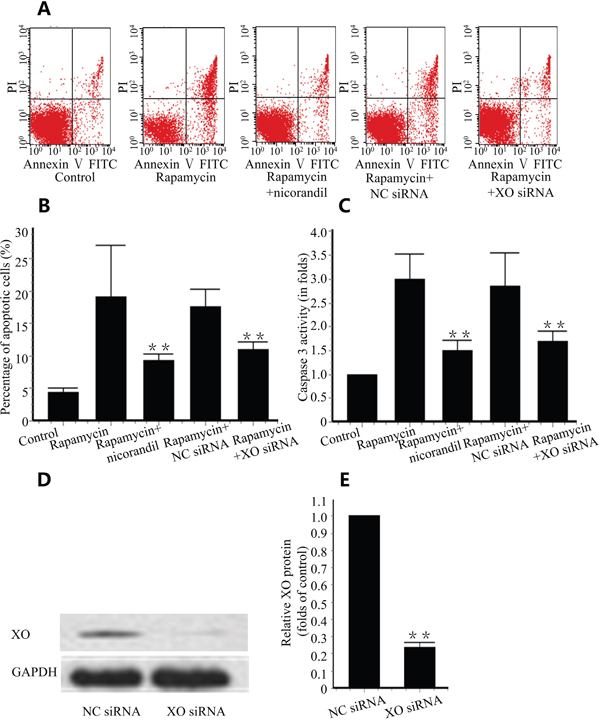 Rapamycin induced cell apoptosis in primary cultures of CMECs. Nicorandil reduced cell apoptosis induced by rapamycin from 20.04±8.59% to 9.29±0.94% (p<0.01) (Figure 4A and Figure 4B). Caspase 3 is an essential enzyme regulating cell apoptosis. Rapamycin increased caspase 3 activation in CMECs, and nicorandil inhibited this caspase 3 activation (Figure 4C). Since XO is activated in injured arteries, we tested the role of XO in apoptosis. 48h post-XO siRNA transfection, XO protein level was significantly decreased compared to cells treated with negative control siRNA (Figure 4D and Figure 4E). XO knockdown reduced cell apoptosis induced by rapamycin (p<0.01) (Figure 4A and Figure 4B). In XO-knockdown CMECs, caspase 3 activity increased by rapamycin is also reduced (p<0.01) (Figure 4C).