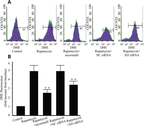 Figure 5: Nicorandil inhibits ROS production in CMECs. A., Intracellular ROS production was detected by DHE staining and assessed by flow cytometry. CMECs were incubated in rapamycin or nicorandil for 24 h (n=3). CMECs were transfected by XO siRNA or NC siRNA. B., Summery data of DHE fluorescence in different groups. Values are mean±SE. **p<0.01 vs. rapamycin group.