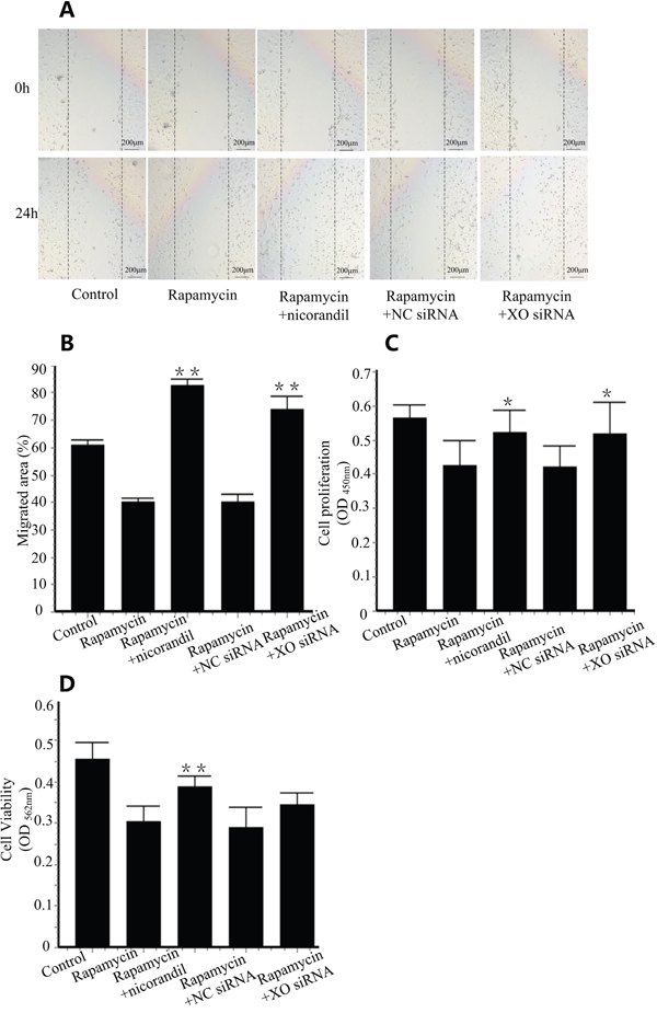 Figure 6: Nicorandil promotes CMECs proliferation and migration. A., CMECs were wounded and treated with media alone, rapamycin (100ng/ml), or rapamycin in the presence of nicorandil (100nM) for 24 h. CMECs were transfected with NC siRNA or XO siRNA (n=3). B., Summary data of cell migration. Values are mean±SE. **p<0.01 vs. rapamycin group. C., CMECs proliferation were determined by BrdU proliferation assay kit (n=3). Values are mean±SE. *p<0.05 vs. rapamycin group. D., Cell viability was assessed by MTT assay kit (n=3). Values are mean±SE. **p<0.01 vs. rapamycin group.