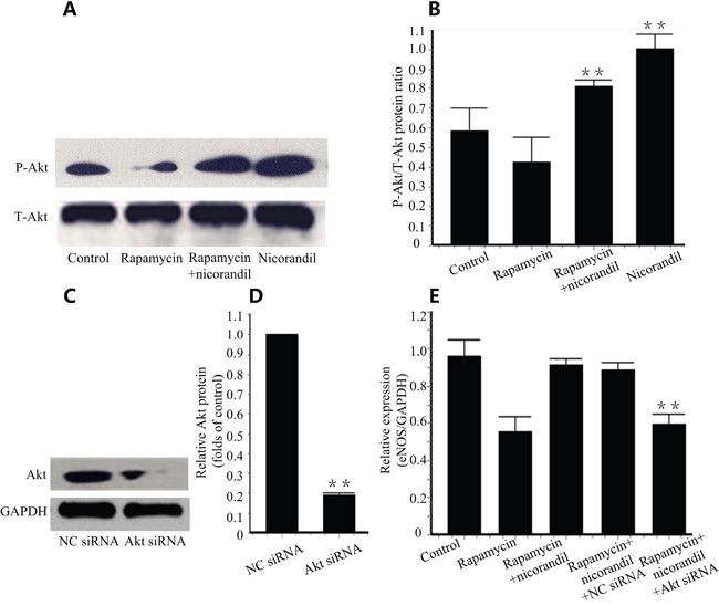 PI3K/Akt phosphorylation increases cell proliferation [19], and it is upstream of eNOS [20]. We tested Akt phosphorylation by western blotting. Expectedly, phosphorylation of Akt was inhibited by 24h of rapamycin incubation. Additional treatment of nicorandil promoted Akt phosphorylation in CMECs (P<0.01) (Figure 7A and Figure 7B). When Akt knockdown is achieved by Akt siRNA transfection (Figure 7C and Figure 7D), eNOS expression in CMECs induced by nicorandil is reduced (P<0.01) (Figure 7E).