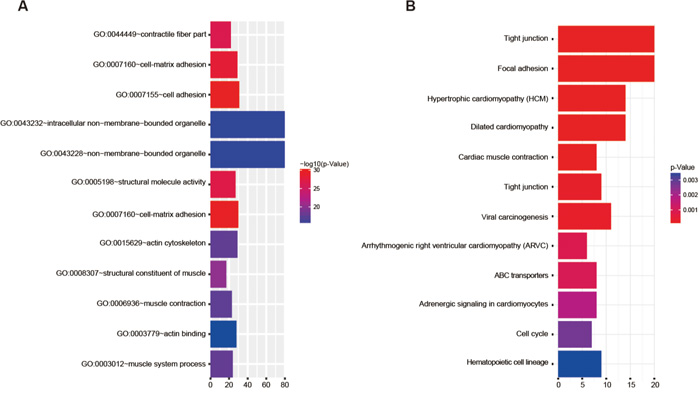 Figure 2: GO functional analysis and KEGG pathway analysis. The target genes are concentrated in A. 12 major GO terms and B. 12 major KEGG pathways.