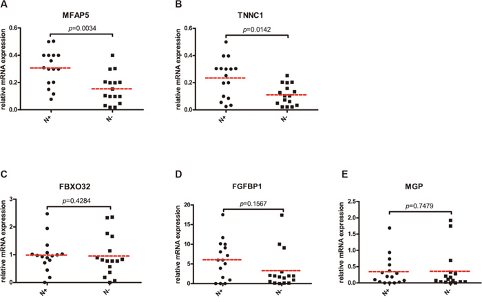 Figure 3: Quantitative comparison of MFAP5 (A), TNNC1 (B), FBXO32 (C), FGFBP1 (D) and MGP (E) mRNA expressions in 16 paired TSCC with or without occult CLNM. P values were presented. N+: TSCC with occult CLNM; N-: TSCC without occult CLNM.