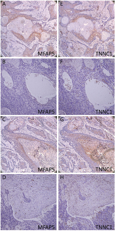 Figure 4: Immunohistochemistry of MFAP5 and TNNC1. A. E. strongly positive; B. F. Weak positive; C. G. Negative cancer cells; D. H. Negative CAFs.