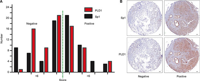 Evaluation of the staining was performed by two independent pathologists blind to research in at five areas at 400× magnification. The staining was scored according to the intensity and percentage of the stained cells. Staining intensity was assigned as 0 (no staining), 1 (weak staining), 2 (moderate staining), and 3 (strong staining). The percentages were classified into: 1 (≤ 25%), 2 (25%–50%), 3 (50%–75%), and 4 (75%–100%). The final scores were calculated as the staining intensity × the percentage of positive cells. For statistical analyses, a score < 6 was regarded as negative expression, and > 6 as positive expression. The dilution of the primary antibodies: Sp1 (1:100); PLD1 (1:100).