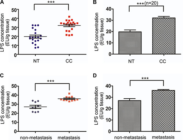 Figure 1: LPS concentration in colorectal cancer tissues and normal mucosa. (A) LPS concentration was significantly higher in 20 colorectal cancer tissues compared with matched normal tissues. (B) Average LPS concentration in 20 colorectal cancer tissues and matched normal tissues. (C) Lymph node metastasis (n = 11) and none lymph node metastasis (n = 9) colorectal tissue LPS concentration. (D) Average LPS concentration of Lymph node metastasis and none lymph node metastasis colorectal tissues. Expression was shown for LPS quantity in 1 gram colorectal tissue (EU: endotoxin unit).