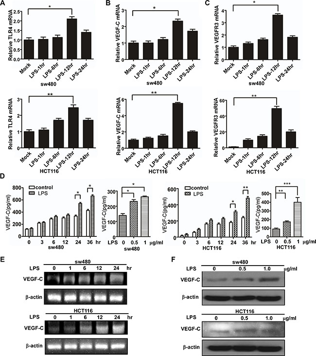 Figure 2: LPS treatment enhances VEGF-C expression in colorectal cancer cells. (A–C) The mRNA of TLR4, VEGF-C and VEGFR3 in the mock, LPS-stimulated (1 μg/ml) sw480 and Hct116 colorectal cells by real-time PCR. (D) The protein expression of VEGF-C from the mock, LPS-stimulated sw480 and Hct116 colorectal cells by ELISA. (E) VEGF-C mRNA expression in the mock, LPS-stimulated (1 μg/ml) sw480 and Hct116 cells by agarose gel electrophoresis. (F) The protein expression of VEGF-C from the mock, LPS-stimulated sw480 and Hct116 colorectal cells by western blot. Error bars represent mean ± SEM, representative of three experiments, *p < %0.05, **p < %0.01, ***p < %0.001.