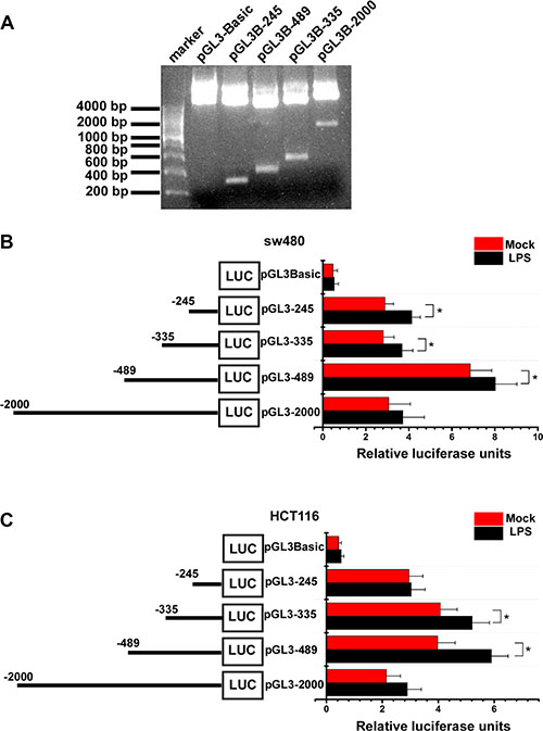 For sw480, more relative luciferase units were detected in LPS treated groups, significantly in pGL3-245, pGL3-335 and pGL3-489 (Figure 3B). For Hct116, more relative luciferase units were detected in LPS treated groups, significantly in pGL3-335 and pGL3-489 (Figure 3C).