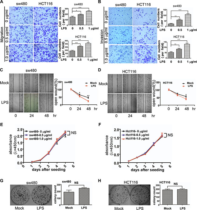 Figure 4: Effects of LPS on cell motility and proliferation of sw480 and Hct116 cells. (A and B) Representative images of migrated and invaded colorectal cancer cells through chambers’ membrane (100×) treated with LPS ( 0 , 0.5 , 1 μg/ml). Cell numbers were counted in three randomly selected microscopic fields. (C and D) Representative images of mock and LPS-stimulated colorectal cancer cell wound healing (40×). Microscopic observations were photographed 0, 24 and 48 hours after scratching the cell surface. (E and F) Effects of LPS (0 , 0.5 , 1 μg/ml) on cell growth by CCK8 assay. (G and H) Effects of LPS (1 μg/ml) on cell growth by colony formation assay. Error bars represent mean ± SEM, representative of three experiments , *p < %0.05 , **p < %0.01, ***p < %0.001, NS p > 0.05. Scale bars represent 1000 μM.