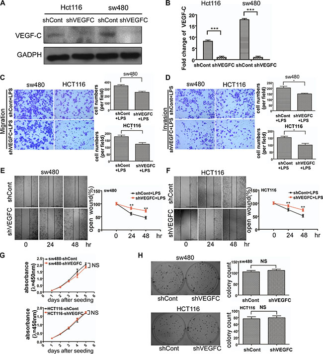 Figure 5: Effects of VEGF-C on cell motility and proliferation on sw480 and Hct116 cells. (A) Western blot analysis of identifying VEGF-C expression in VEGF-C knockdown sw480 and Hct116. The quantified analysis of the expression of VEGF-C has been presented on (B). (C and D) Representative images of migrated and invaded colorectal cancer cells through chambers’ membrane (100×). Cell numbers were counted in three randomly selected microscopic fields. (E and F) Representative images of LPS stimulated shControl and shVEGFC colorectal cancer cell wound healing (40×). Microscopic observations were photographed 0, 24 and 48 hours after scratching the cell surface . (G) Effects of VEGF-C on cell growth by CCK8 assay. (H) Effects of VEGF-C on cell growth by colony formation assay. Error bars represent mean ± SEM, representative of three experiments, *p < %0.05, **p < %0.01, ***p < %0.001, NS p > 0.05. Scale bars represent 1000 μm.