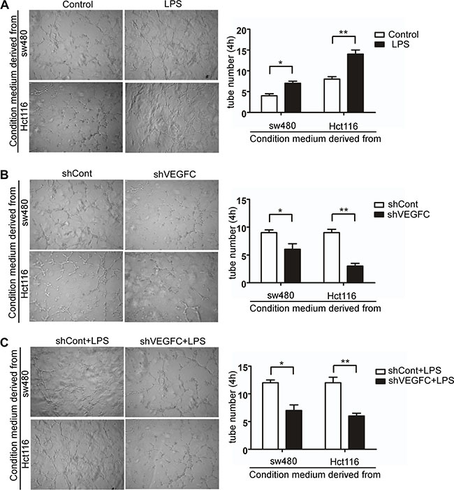 In the present study, we performed an indirect co-culture system to evaluate the role of LPS in lymphangiogenesis in vitro. We evaluated the tubule formation capacity of HDLECs, which is an essential step for lymphangiogenesis. As shown in Figure 6A, after co-cultured with LPS treated colorectal cells’ supernatants over 4 hours, the tubule-like structure formation capacity of HDLECs increased compared with control group in sw480 and Hct116 (p < 0.05 and p < 0.01). And silencing VEGF-C significantly decreased HDLECs’ capacity of tubule-like structure formation (Figure 6B). As show in Figure 6C, VEGFC down-regulation suppressed LPS stimulated tubule formation capacity of HDLECs. These results indicated that LPS promotes lymphangiogenesis via VEGF-C.