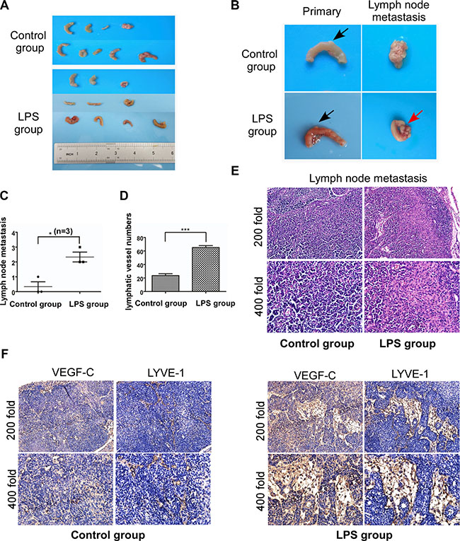 Figure 7: LPS promotes lymphangiogenesis and lymph node metastasis via VEGF-C in vivo. (A and B) Mice were sacrificed and primary tumor (black arrow) and metastatic lymph node (red arrow) were collected. (C) Numbers of lymph node metastasis for control group and LPS treated group. (D) Lymphatic vessel density of metastatic lymph node (LPS group) and normal lymph node (control group). (E) Metastatic and normal lymph nodes H-E staining. (F) Metastatic and normal lymph nodes staining with antibodies to VEGF-C and LYVE-1. Error bars represent mean ± SEM, representative of three experiments, ***p < %0.001.