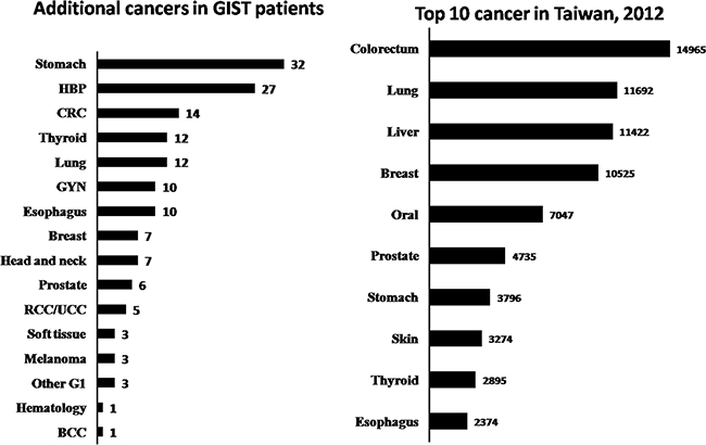 Figure 1: Comparison of ranks of the additional malignancies in GIST patients, in decreasing order, with the top-10 cancers that occurred in Taiwan in 2012.