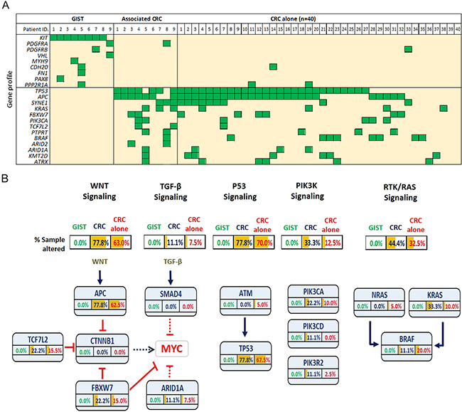 Figure 3: A. Summary of the gene mutations in GISTs (n=9) and associated colorectal cancers (CRCs), with an independent cohort of sporadic CRCs without GIST (n=40) serving as a control. B. Proportion of mutated individual genes, involved in various signaling pathways, in GISTs and in CRCs with and without associated GISTs.