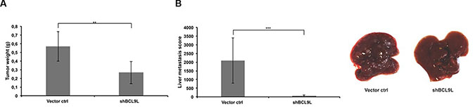 Figure 6: BCL9L knockdown inhibits growth and abrogates liver metastasis of pancreatic cancer cells in vivo. (A) Orthotopic xenografts of Panc-1 control and BCL9L knockdown cells were established in NMRI:nu/nu mice (6 mice per group) as described in the Methods section. 5 weeks after cell implantation tumor weights were determined and revealed a significantly reduced tumor mass in mice xenografted with BCL9L knockdown cells compared to controls. (B) Panc-1 BCL9L knockdown and control cells were injected into the tail vein of NMRI:nu/nu mice. 5 weeks after injection, liver metastases were scored. BCL9L-knockdown significantly impaired implantation of Panc-1 cells to the liver. Right panel: representative photographs of livers from BCL9L-knockdown xenograft mice (right) illustrate the reduction in number and size of tumor nodules compared to controls (left). Data represent mean ± s.e.m. of experimental groups each representing 6 animals. **p ≤ 0.01, ***p ≤ 0.001 (Student’s t-test).