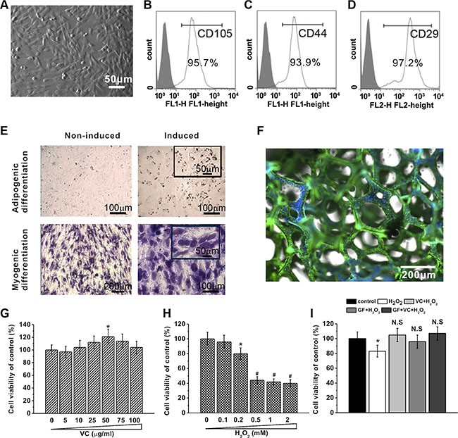 Figure 3: BM-MSCs growth under different concentrations of VC, H2O2 treatment or on GF substrates. (A) Representative image of BM-MSCs 5 days after seeding. (B–D) Characterization of BM-MSCs by flow cytometry. The majority of the cells are CD105+, CD44+ and CD29+, which are typical characteristic phenotypes of BM-MSCs. (E) BM-MSC can be differentiated into adipogenic and myogenic lineages. Adipogenic differentiation was characterized by Oil Red O staining, while myogenic differentiation was evidenced by the formation of myotubes stained with crystal violet. (F) Representative image of immunostaining of BM-MSCs on GF scaffold, stained by anti-β-tubulin (green) and DAPI for nucleus (blue). Effects of different concentrations of VC (5 to 100 μg/ml, 5 days) (G) and H2O2 exposure (0.1 to 2 mM, 24 hours) (H) on cell viability of BM-MSCs cultured for 5 days, measured by MTT assay. (I) Cell viability of BM-MSCs in the five experimental groups. Data were presented as mean ± SEM. *p < 0.05 vs control.