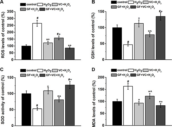 Figure 4: GF, VC and GS + VE successfully attenuated 0.2 mM H2O2-induced oxidative stress in BM-MSCs. Oxidative stress was characterized by determining the intracellular ROS levels (A), GSH levels (B), SOD activity (C) and MDA levels (D) in the cultures for 7 days. Data were presented as mean ± SEM. *p < 0.05 and #p < 0.01 vs control, ^p < 0.05 and +p < 0.01 vs H2O2 treatment group.