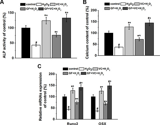 Figure 6: Both GF and VC protected against 0.2 mM H2O2-induced inhibition of osteogenic differentiation of BM-MSCs. ALP activity (A) and calcium contents (B) of the cultures of the four experimental groups normalized to control. (C) Relative mRNAs expressions of Runx2 and Osx in the four experimental groups, quantified by RT-PCR. Data were presented as mean ± SEM. *p < 0.05 and #p < 0.01 vs control, ^p < 0.05 and +p< 0.01 vs H2O2 treatment group.