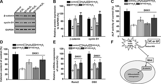 Figure 7: Wnt pathway was involved in the protective effects of GF and VC on the inhibition of osteogenic differentiation induced by 0.2 mM H2O2. (A) Western blot analysis (A) and the relative protein expression (B) of Wnt pathway-related regulators β-catenin and Cyclin D1 in the cultures of experimental groups. DKK-1, wnt pathway inhibitor, blocked the protective effects of VC or GF on the inhibition of osteogenic differentiation by H2O2 exposure, as evidenced by ALP activity (C), calcium contents (D) and relative mRNAs expression of Runx2 and Osx (E). (F) A schematic picture showing the possible role of wnt signaling pathway. Data were presented as mean ± SEM. *p < 0.05 and #p < 0.01 vs control, ^p < 0.05 and +p < 0.01 vs H2O2 treatment group.