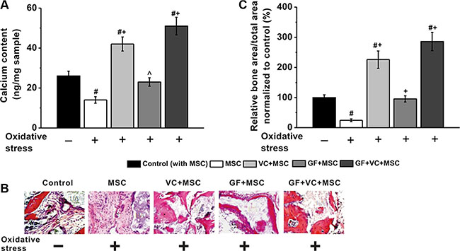 Figure 8: VC and GF facilitated in vivo osteogenesis of MSCs impaired by oxidative stress. VC, GF and co-treatment of VC and GF groups enhanced calcium contents in an in vivo nude mice model (A). (B) Representative images of H&E staining of tissue samples in these five experimental groups. (C) Quantitative analysis of the amount of new bone formation in these groups. Data were presented as mean ± SEM. #p < 0.01 vs control mice without oxidative stress, ^p < 0.05 and +p < 0.01 vs mice with oxidative stress.