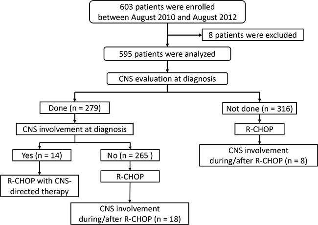 The inclusion criteria of our PROCESS (Prospective Cohort Study with Risk-Adapted Central Nervous System Evaluation in DLBCL) cohort were patients: (1) with newly diagnosed DLBCL according to the 2008 World Health Organization classification; (2) planned to receive R-CHOP as a primary treatment; (3) with ≥ 20 years of age; (4) with written informed consents. Patients with primary DLBCL of the CNS (PCNSL) were excluded. The diagnosis of CNS involvement was based on the presence of lymphoma cells in CSF cytology or brain parenchymal lesion on imaging studies. Incidence rate of CNS involvement at diagnosis and CNS relapse during or after R-CHOP chemotherapy were estimated, respectively. The actuarial incidence and analyses of CNS relapse was obtained after excluding patients with CNS involvement at diagnosis and then by censoring patients with follow-up loss or death before the occurrence of CNS involvement. The primary endpoint was incidence and risk factors for CNS relapse. The secondary endpoints were incidence of CNS involvement at diagnosis, OS, PFS, and time to CNS involvement. The OS was calculated from the time of diagnosis to the date of last follow-up or death from any cause whereas PFS was from the date of diagnosis to the date of relapse or progression or the last follow-up or death from any cause. The time to CNS involvement was from the date of diagnosis to the date of CNS relapse, and patients who were died from any cause before the CNS relapse occurred were censored. The study was approved by relevant institutional review boards of the participating institutes.