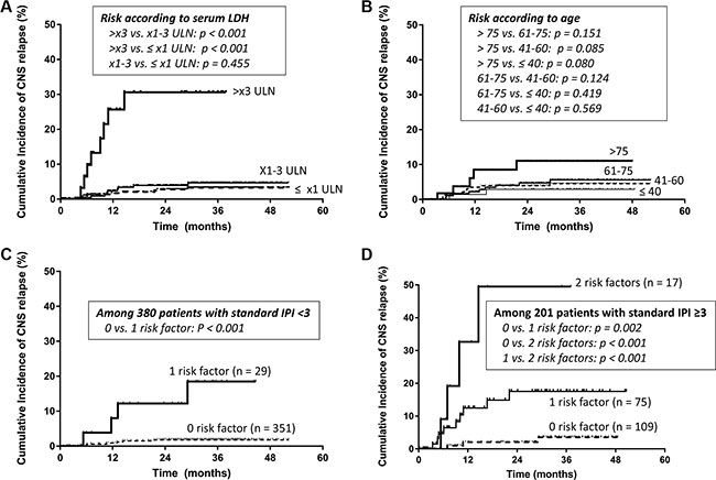 In conclusion, very high serum LDH was an independent prognostic factor for CNS relapse in addition to ECOG PS ≥ 2 and involvement of sinonasal tract or testis in patients with DLBCL treated with R-CHOP. Future studies on the prognostic role of the enhanced stratification of previously known risk factors and the novel morphological or biological classifications of DLBCL for CNS relapse may contribute to define higher risk group for CNS relapse.