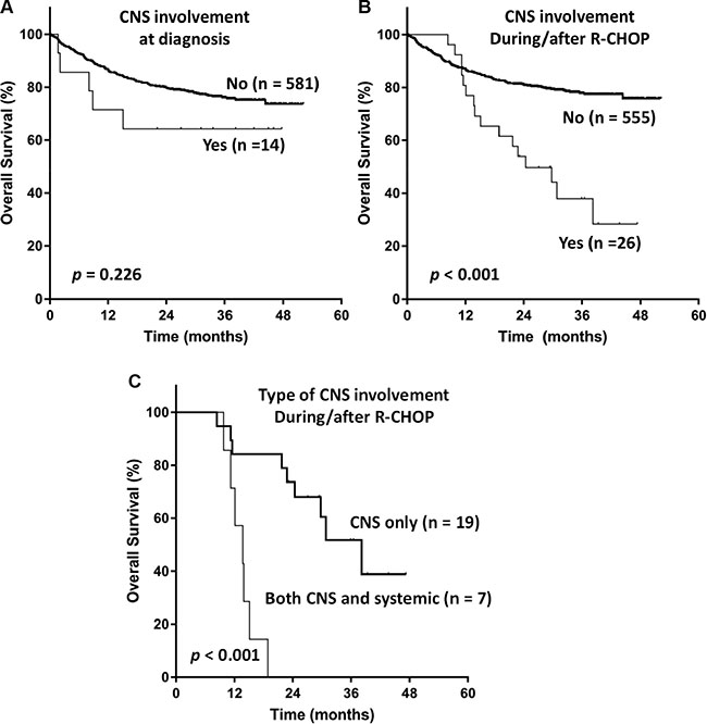 Figure 3: Kaplan-Meier curves for overall survival of patients according to (A) central nervous system involvement (CNS) at diagnosis, (B) CNS involvement during or after immunochemotherapy, and (C) the pattern of CNS involvement during or after immunochemotherapy.