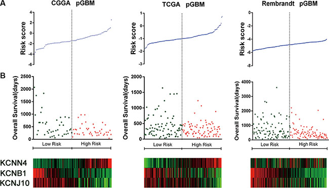 A total of 280 ion channel genes were collected for the present study (Additional file 1: Supplementary Table S1). To identify ion channel genes which were associated with grade progression, we first compared genome expression in grade II or grade IV gliomas with that in grade III gliomas (II VS III and III VS IV) in CGGA dataset of gliomas, then a two-sided log-rank test was used to analyze each ion genes in GBM patients. Finally, three channel genes (KCNN4, KCNB1 and KCNJ10) were identified to be significantly correlated with malignant progression and associated with OS (Supplementary Figure S1, Supplementary Table S2). The expression value of KCNN4 is upregulated and KCNB1 and KCNJ10 are downregulated in gliomas. We then applied the three genes as a signature to develop a risk score formula by using the risk score method. The risk score for each patient was then calculated. Using the median risk score as the cutoff value, the patients were successfully divided into a high risk group and a low risk group. The patients with the high risk score had a shorter median OS than patients with the low risk score in GBM and pGBM. (p < 0.001) (Figure 1A–1B). The risk score and OS distribution were shown in Figure 2A and 2B.
