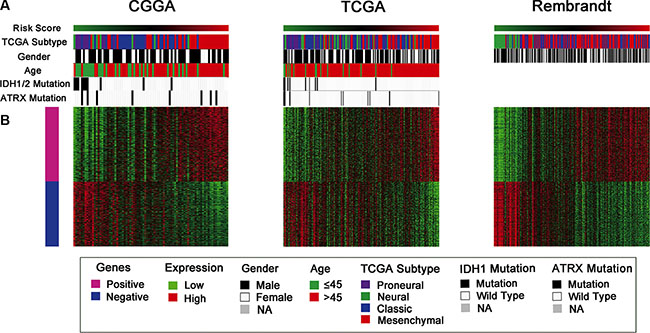 Figure 4: Distribution of molecular and clinical pathological features for pGBM patients in three datasets. (A) The high risk score tumors displayed Mesenchymal subtype and wild-type IDH1 preference. (B) The differentially expressed genes were shown arranged from the low to high risk score. Pink represents the high expression of genes in the high risk group; blue represents the low expression of the genes in high risk group.