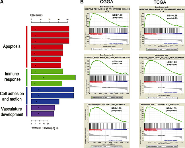 Figure 5: Functional annotation of the high risk group. (A) GO analysis revealed the significant association of the genes with increased expression in high risk group with four main pathways. Column height: gene counts; point height: enrichment p value. (B) Three representative plots of GSEA from enriched pathways in high risk group, analyzed by gene set enrichment analysis of CGGA and TCGA RNAseq data.