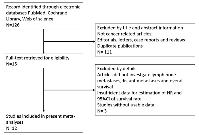 As shown in the flow diagram (Figure 1), a total of 126 published articles were revealed in our initial search by using the keywords. After screening the title and abstract carefully, 111 articles were excluded. After further inspection of the full articles, 2 were excluded because there is no available information in their records. In the 13 potential candidate studies, 1 study was excluded because of inadequate data of HR with 95 % CI. Finally, according to the criteria for selection, a total of 12 studies were eligible [5-16].