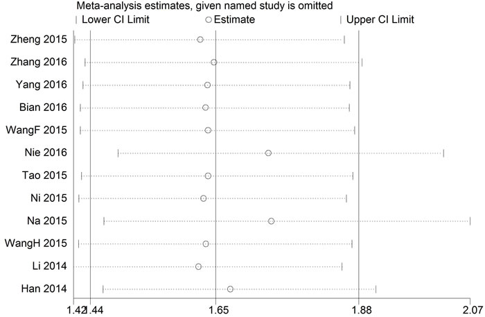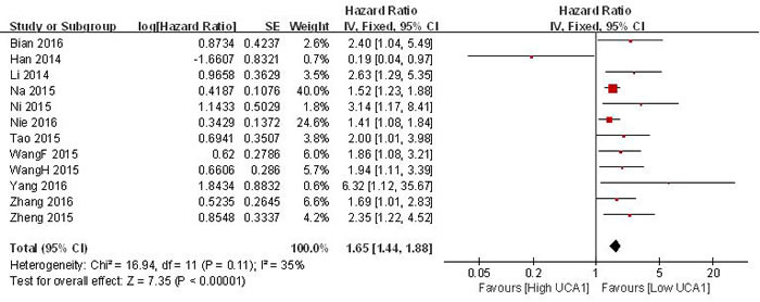 Data of pooled HRs and 95 %CI of overall survival were collected from the 12 eligible studies. The fixed-effects model was used as the small heterogeneity (I2 = 35 %, p = 0.11). Analysis showed a pooled OR of 1.65 with 95 %CI 1.44-1.88 (p < 0.00001) (Figure 3). Compared with low UCA1 expression group, high UCA1 expression group showed a statistically significant reduction in OS and a correlation with a worse survival.
