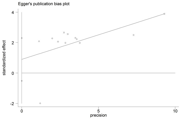 Figure 5: Funnel plot analysis of potential publication bias in OS group (Egger’s test).