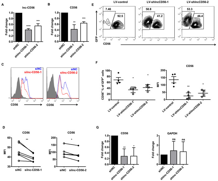 Given that higher lnc-CD56 expression positively correlated with CD56 expression in dNK cells (Figure 6C-6D), we hypothesized that lnc-CD56 may function as a positive regulator of CD56 in human NK cells. We studied the role of lnc-CD56 in modulating CD56 expression using an shRNA-based loss-of-function approach. lnc-CD56 knockdown HEK-293T cells (transfected with lnc-CD56 pMSCV-shRNA) exhibited decreased CD56/NCAM1 mRNA levels (Figure 7A-7B). Similar results were observed in flow cytometry analysis of surface CD56 on dNK cells after transfection with lnc-CD56 siRNAs (Figure 7C-7D), confirming that lnc-CD56 regulates CD56 expression.