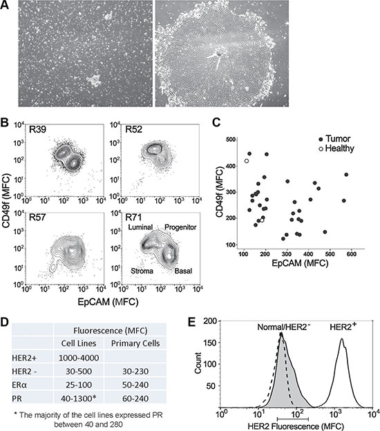 Figure 1: Characteristics of primary epithelial cells derived from patient tissue specimens. (A) A representative culture of primary cells from a digested tumor biopsy at day 1 (a) and day 5 (b) of culture, respectively. (B) Flow cytometric analysis of luminal (EpCAM+, Claudin4+) and basal (CD49f+, CD10+) markers on four representative tumor primary cells harvested at the time of CELx HSP test. (C) Plot showing the Mean Fluorescence Channel (MFC) of the luminal marker EpCAM (x-axis) and the basal/progenitor biomarker CD49f (y-axis) for all 34 tumor samples tested (filled circles). For comparison, 2 healthy samples are displayed (empty circles). (D) Comparison of expression levels of HER2, ERα, and PR between primary cells and cell lines (HER2+ and HER2–), which were measured by flow cytometry. (E) Histogram plot of HER2 expression measured by flow cytometry of a representative tumor (shaded peak) compared to HER2+ cell line SKBR3 (solid line) and HER2- cell line MDA231 (dashed line) that is coincidentally in the same range as the healthy samples. The bar below the graph represents the range of means from all the primary tumors and healthy tissue tested (MFC range 31-210).
